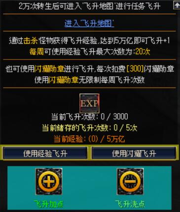 3.转生次数2万转上限,2万次转生后可进入'飞升地图'进行任务飞升.